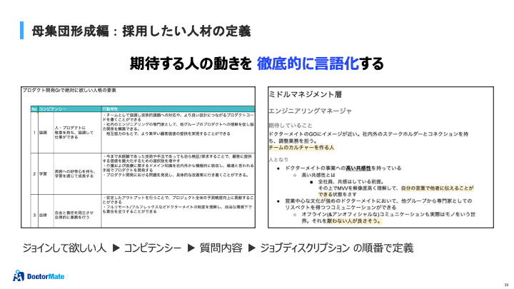 榎本氏:次に各ポジションごとに求める人材に期待することをどんどん深掘りしていくと、人事とエンジニア双方で共通認識が醸成され、ダイレクトリクルーティングでの方針や採用広報のコンテンツ内容・文言などの議論に繋がって行きました。