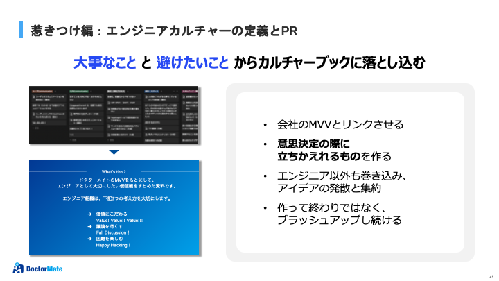 榎本氏:惹きつけを強固にするため行ったことは、自社の価値観の再認識です。特にエンジニアカルチャーを定義するため、経営メンバーも含めてディスカッションを重ね、双方が納得できる落としどころを一緒に作り上げていきました。その際には自社のMVV(ミッション・ビジョン・バリュー)と乖離しない形で、エンジニアカルチャーにも染み込ませています。