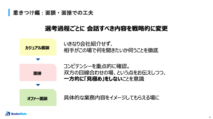 ・カジュアル面談:いきなり会社紹介せず、相手が何を聞きたいかを伺う