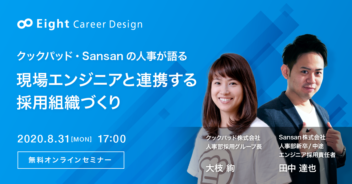 8月31日(月)17:00より、『クックパッド・Sansanの人事が語る 現場エンジニアと連携する採用組織づくり』というテーマでオンラインセミナーを開催いたします。