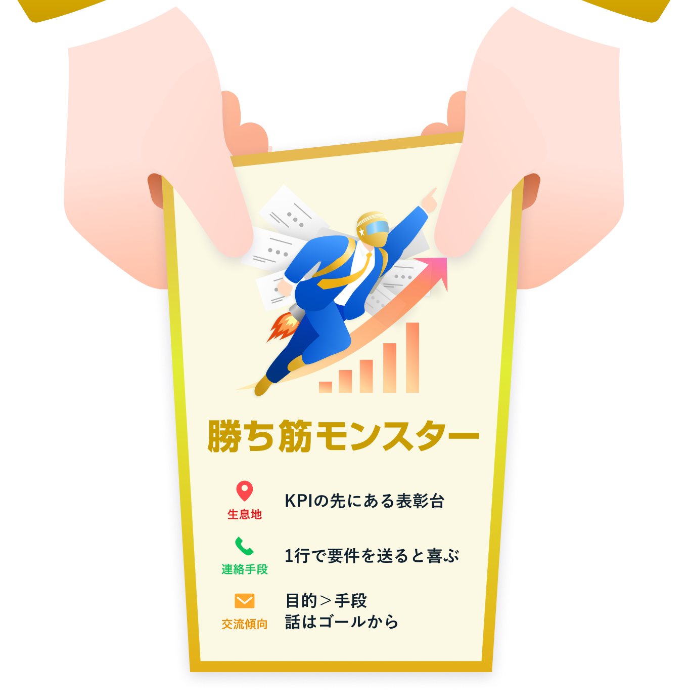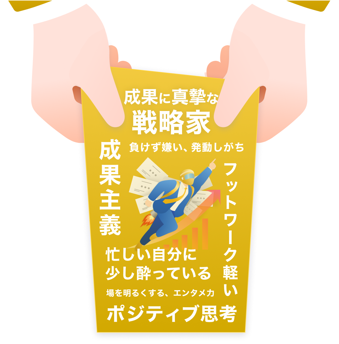 成果への最短ルートを見抜き、誰よりも早く走り出す突破型のビジネスヒーロー。ゴールから逆算して、何をすべきかを即断できる判断力と実行力で、チームを勝利に導きます。勝ち筋が見えたら、もう止まらない。その推進力が、迷いを断ち切り、周囲を巻き込むエネルギーになります。